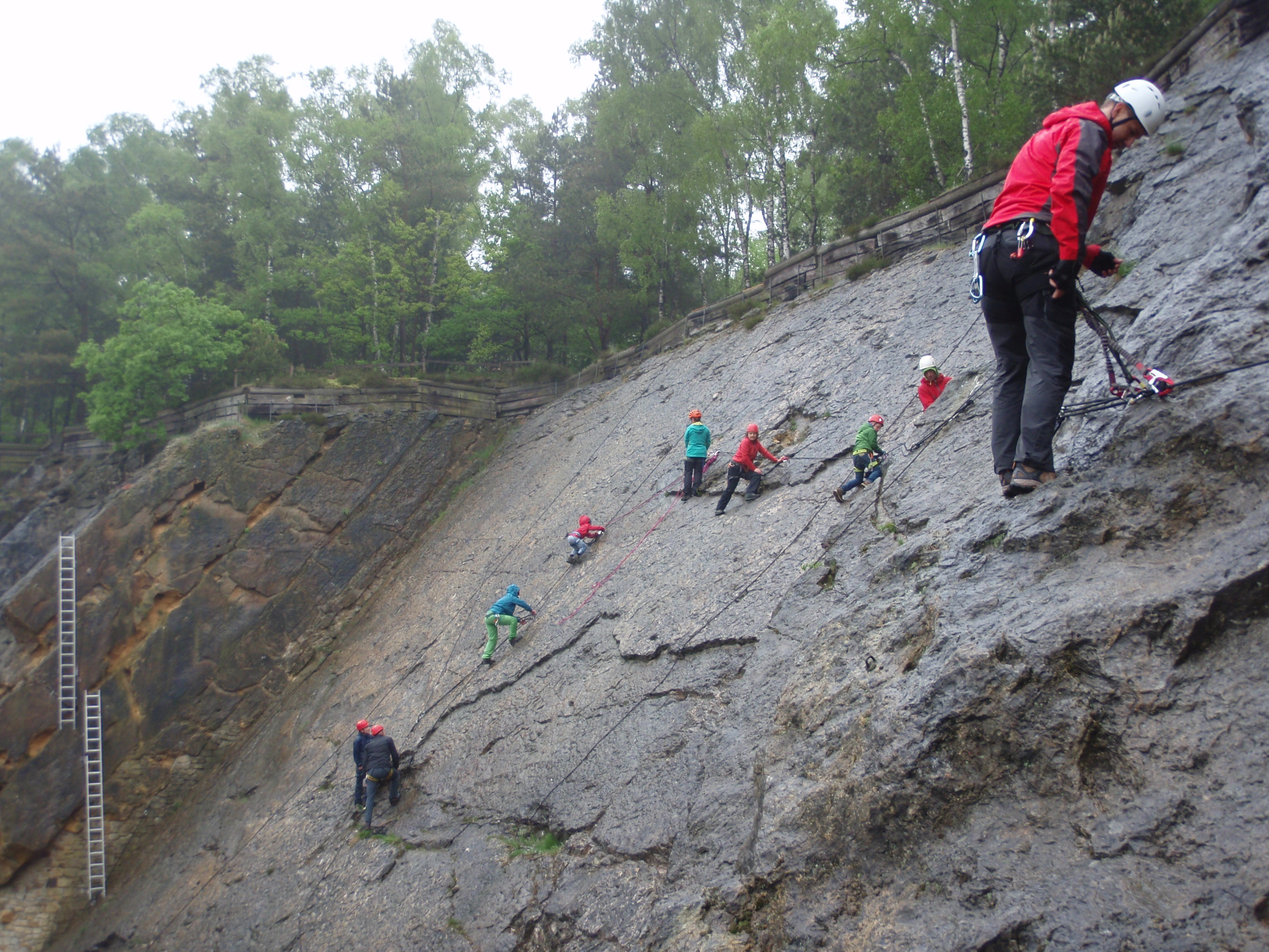 Am Freitagnachmittag trafen alle 24 Teilnehmer pünktlich in der malerischen, direkt an der Burgruine liegenden DJH Tecklenburg ein. Ich hatte diese DJH gewählt, da sie in der Nähe des Klettersteiges im Klettergarten „Brumleytal“ lag, den wir für unsere Fortbildung nutzen durften. Der Klettergarten ist Eigentum der „Bergfreunde Ibbenbüren“, mit denen wir hier erstmalig zusammenarbeiteten. Die Leitung der FOBI hatten die FÜL Christiane und Jens Werchau übernommen. Am Freitagabend ging es nach dem Abendessen und der der obligatorischen Kennenlernrunde mit dem ersten Theorieteil schon richtig los. Die Punkte waren:
